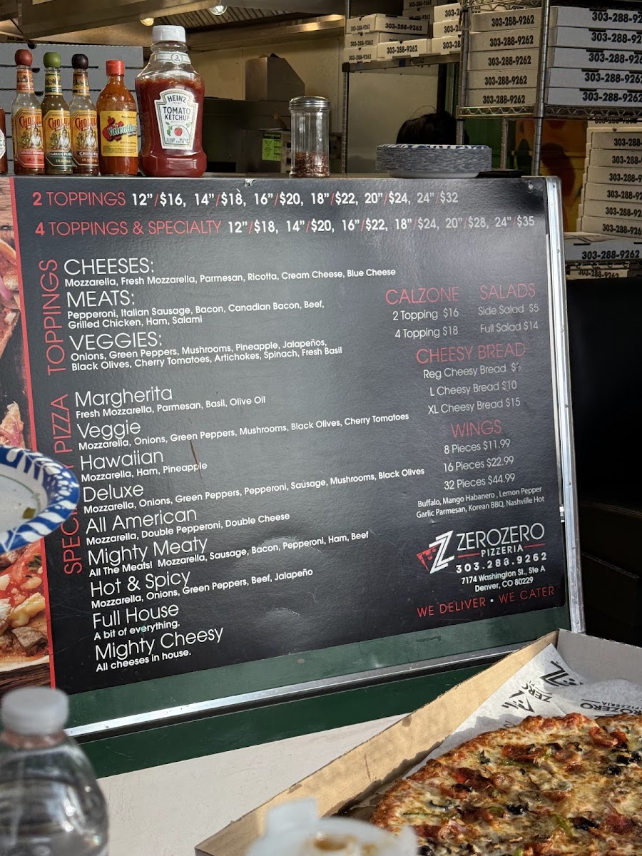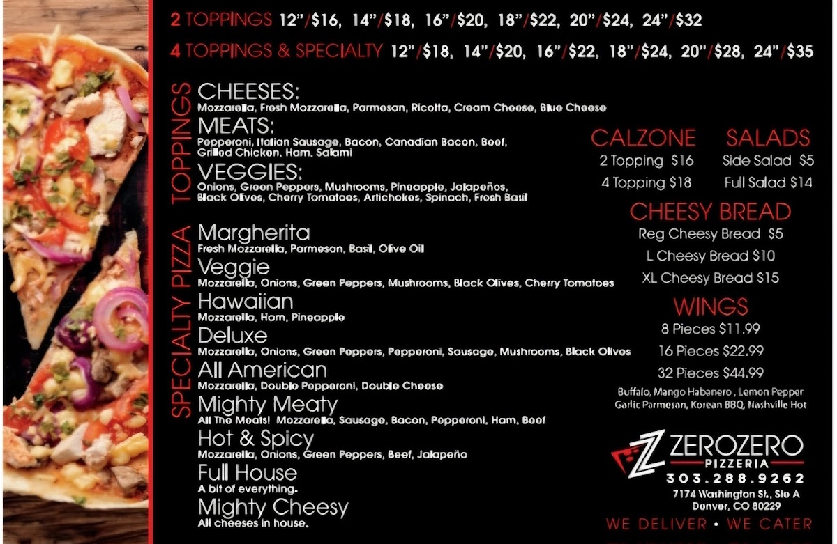 At Zero Zero Pizzeria - 7174 Washington St Ste A on Washington Street in Denver, the menu moves comfortably between timeless Margheritas and bold, topping-loaded creations that feel hearty without being over the top. You’ll also find fresh salads, crave-worthy appetizers, and sides that round out the table effortlessly. Whether you’re in the mood for something simple and cheesy or layered with savory meats and garden-fresh veggies, every option feels thoughtfully put together, the kind of meal you start planning before you’ve even finished the last slice